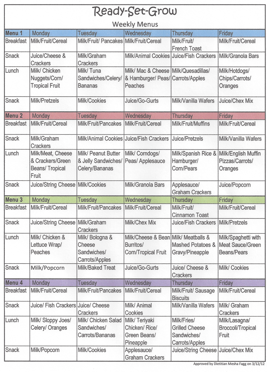 We reserve the right to make substitutions and changes that do not effect the overall nutritional value for the week. We will post the change on the Parent Info wall in the center. For example, February 20th was our Pajama Party day. We had pizza!
